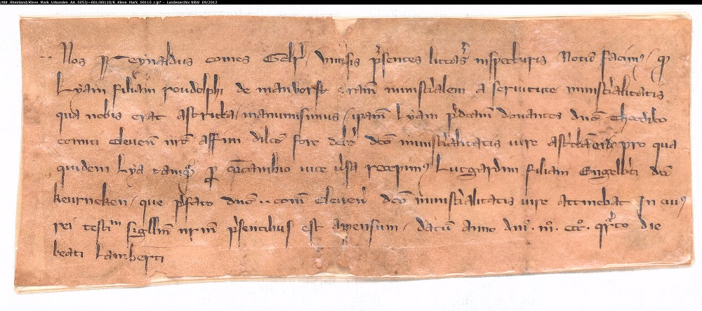 Graaf Reinald van Gelre voegt aan de graaf van Kleve de ministeriale Lya, dochter van Rudolf von Manvorst, tegen Lutgardis, dochter van Engelbert Keurneken.